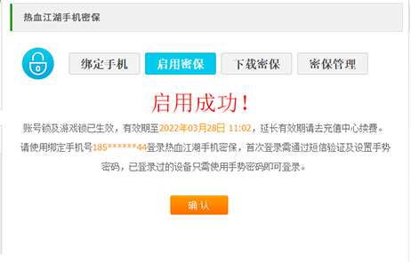 6、首次启用免费7天,到期前、后均可对热血江湖手机密保进行充值,以延长密保服务天数。